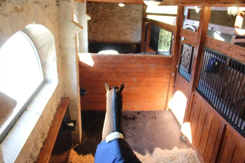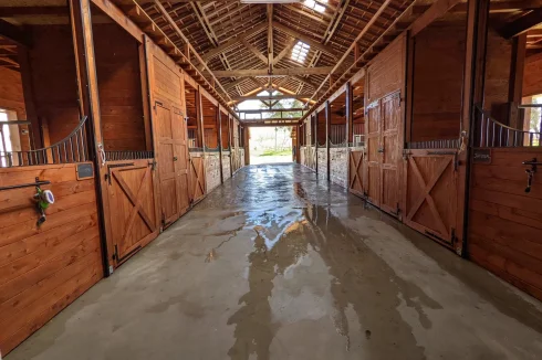 Eight spacious stables with rubber flooring, hot showers, solariums, and private tack lockers.