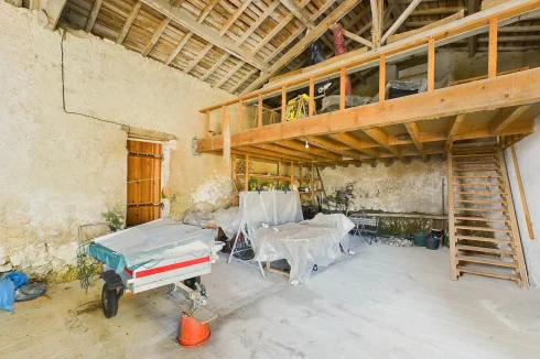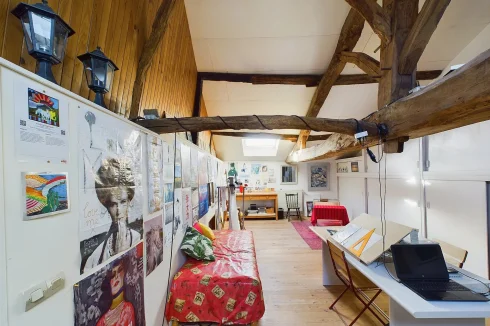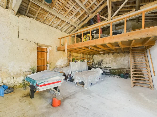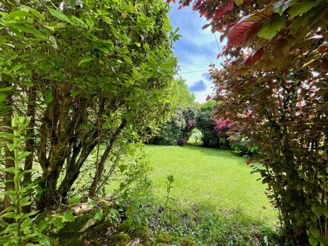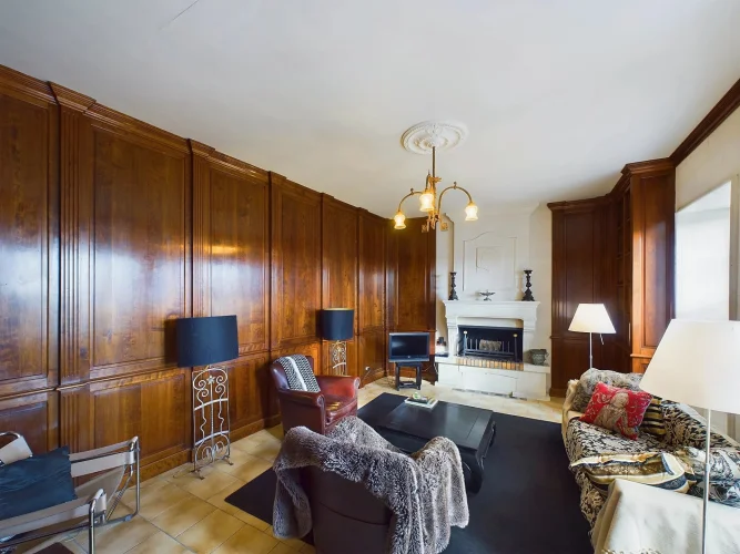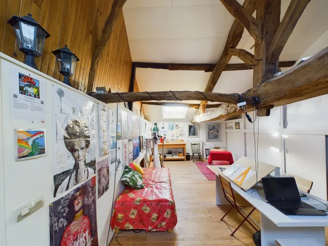 The large master bedroom has French doors opening onto the rear garden, where you can enjoy nature and tranquillity. A small corridor leads to the family bathroom with bath, shower and sink. The house also has two separate toilets, one of which is on the ground floor. The staircase and attractive wooden landing lead to 4 tastefully renovated bedrooms, each with its own washbasin and one with a bidet. On the second floor is a lovely open-plan space currently used as an atelier. A spacious garage with separate wood shed and mezzanine with direct access to the rear garden complete the property.