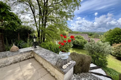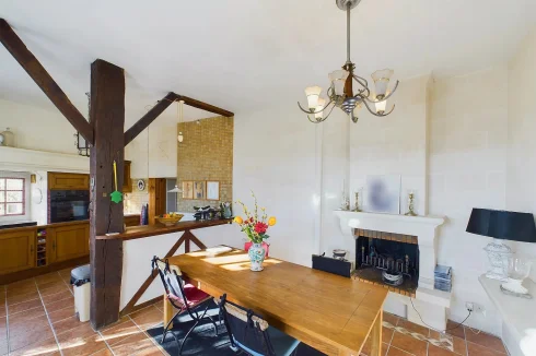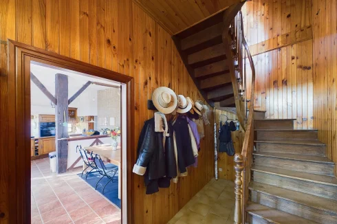As soon as you enter, the beautiful wooden staircase immediately catches your eye. A cosy living room with a fireplace and, on the other side, a welcoming kitchen also with a fireplace and French windows opening onto the stone walled terrace and steps leading down to the front garden. A second, very spacious ‘summer kitchen’ is located on the lower level in an annexe to the house and offers great potential as additional space.