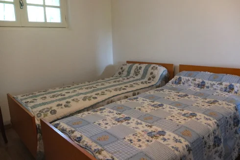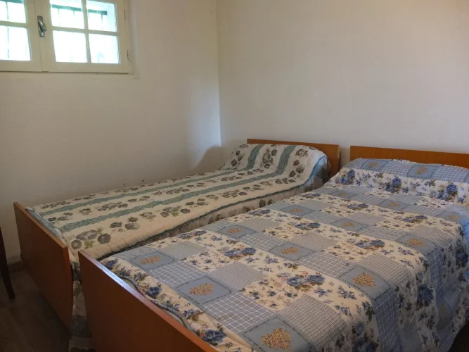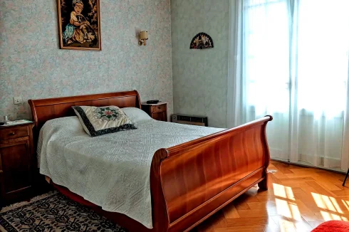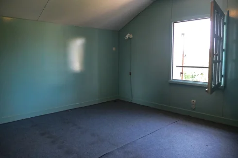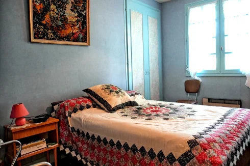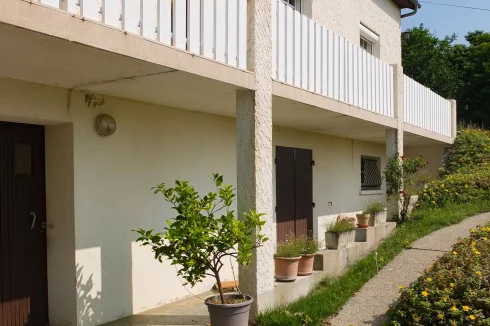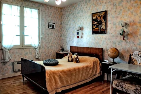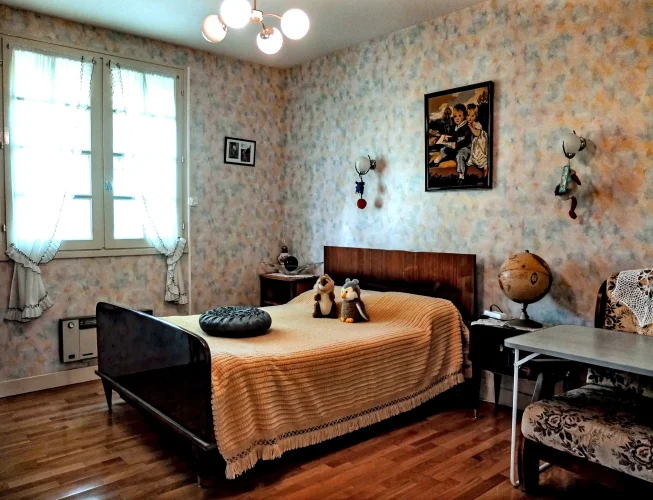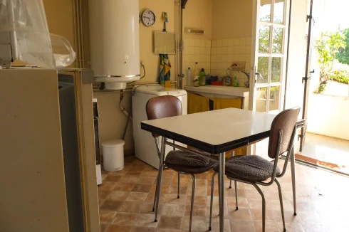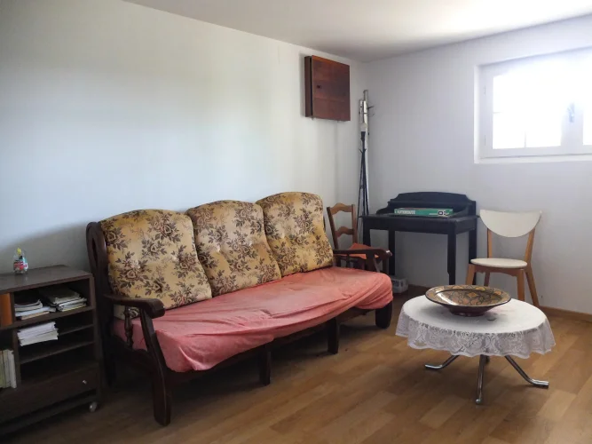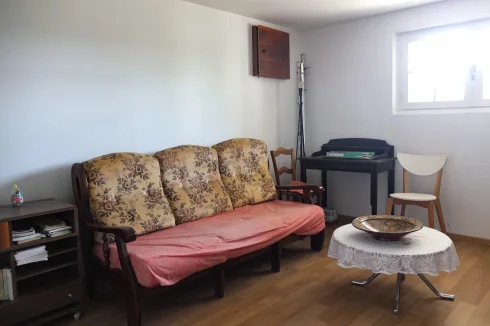 The main 102m² residence on the first floor features a bright and spacious living room, a separate kitchen, three bedrooms with built-in wardrobes, a shower room and a separate toilet. Above, a large attic offers additional space with two rooms in need of updating and an existing toilet—ideal for further development or storage.