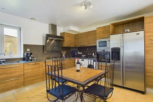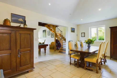 The second house on the estate, a former tobacco barn, has been carefully renovated and now offers 187m² of additional living space. Currently run as a gîte (a future owner would need to obtain necessary permission and appropriate business registration). It features its own private entrance, a large lounge-dining room with vaulted ceiling and mezzanine games area, a breakfast kitchen, and three bedrooms. French doors open onto a private terrace with far-reaching valley views and direct access to the saltwater swimming pool.