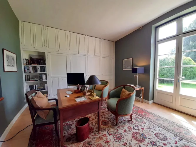 The original chateau entrance opens into a grand hall that leads to a magnificent 41m² lounge with soaring beamed ceilings and French doors to the garden. A second 30m² lounge features a striking fireplace, while the dining room, with its woodburner, terracotta floors, and exposed beams, is full of character. The modern kitchen includes a pantry and boiler room while retaining its period charm. On the ground floor you will also find a laundry room, guest toilet, and a bedroom with en suite bathroom and terrace access, currently used as an office.