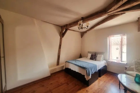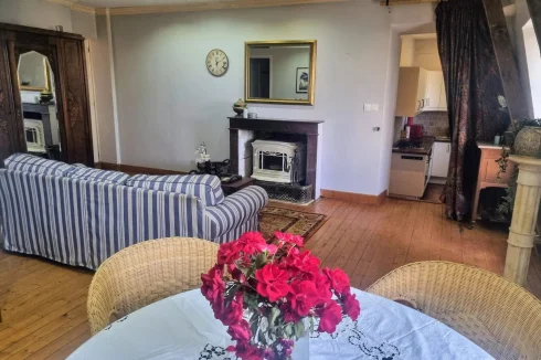 Inside, you’ll find a light-filled living and dining room with charming exposed beams, a feature stone wall and a fireplace with a cosy wood-burning stove. There are two double bedrooms plus a small dressing room currently used as a single guest room (or perfect for bunk beds). Part double-glazing is installed, and the DPE rating is D.