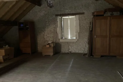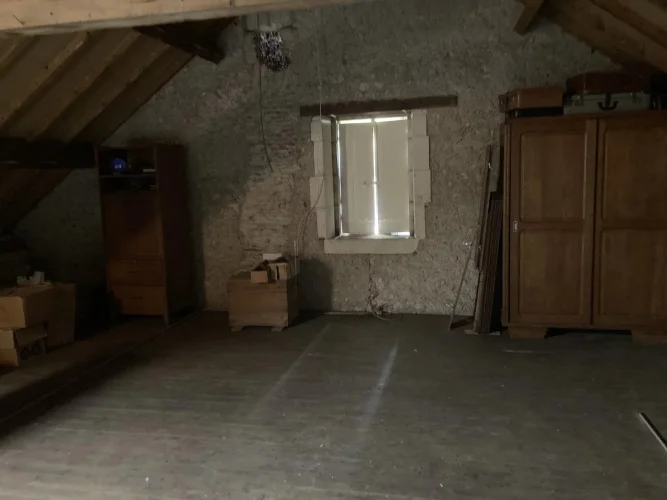 Separate bathroom. Attic space with windows and standing height. Beautiful large mature garden. Huge barn with a separate room with old stone fireplace.