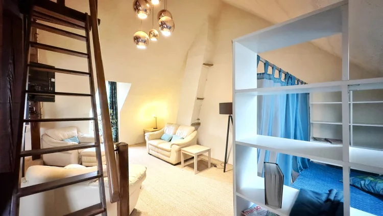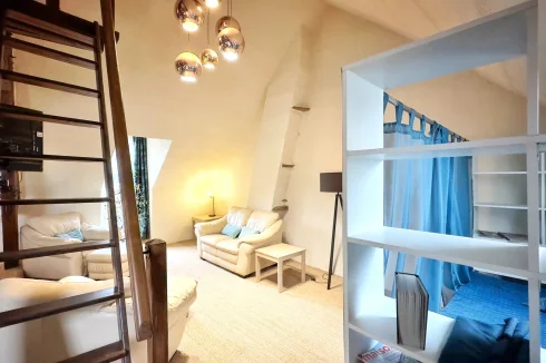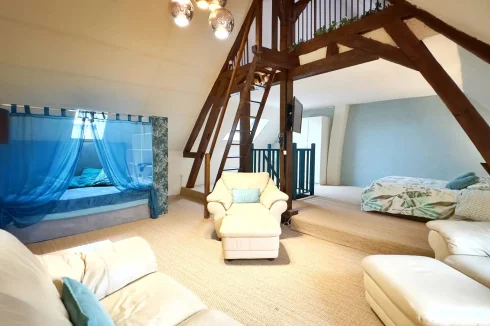 Descend the original feature staircase to the lower ground floor and you will find an attractive country kitchen with a separate entrance onto the street at the side. A spiral staircase from the ground floor leads to the master bedroom in the eaves, with large storage area. A second staircase leads to a lovely large bedroom/living area with a mezzanine, ideal for additional accomodation.