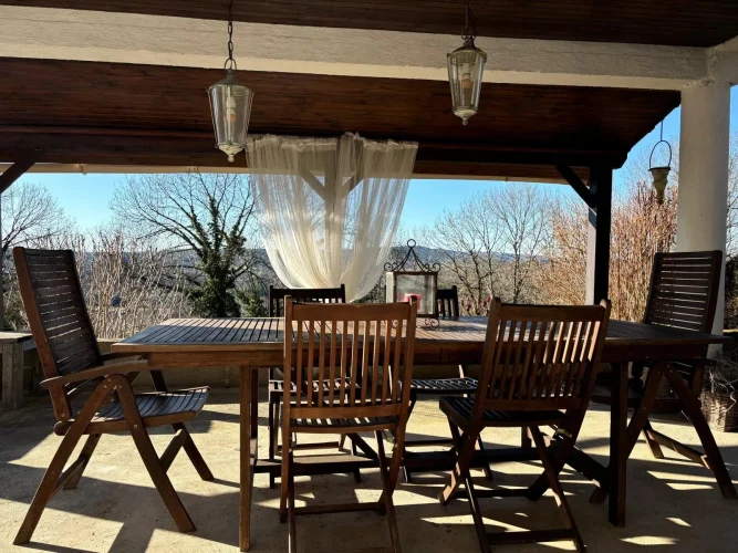 Outside is the jewel of this property: the very large, covered veranda overlooking the terraced landscaped garden dropping down into the valley, and the historic town of Bourganeuf. Plus, an enclosed private garden and a garage.