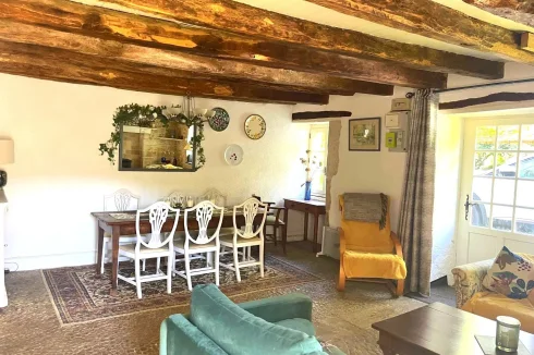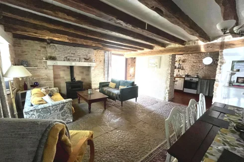 Step through the front door into a spacious sitting/dining room, complete with a large log burner—perfect for cosy evenings. The adjoining galley-style kitchen is full of personality and comes well equipped.