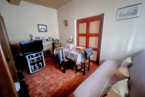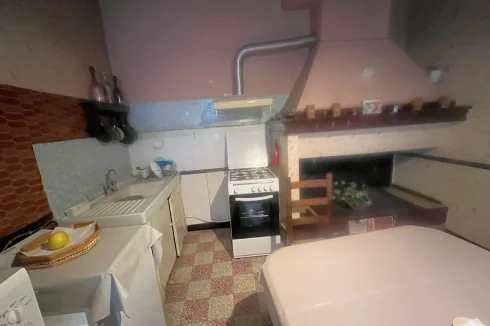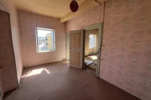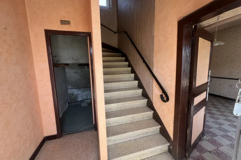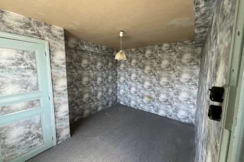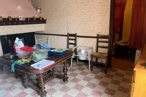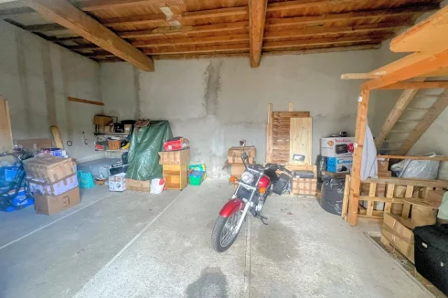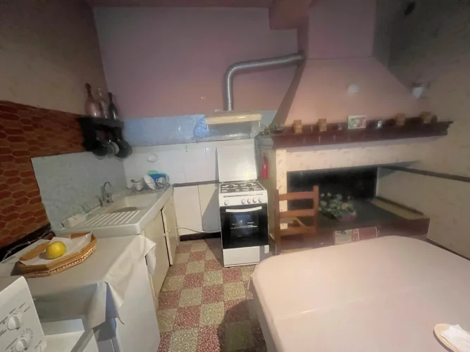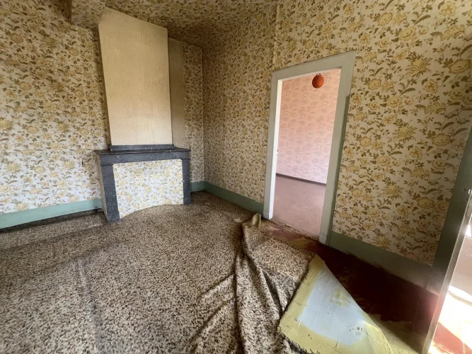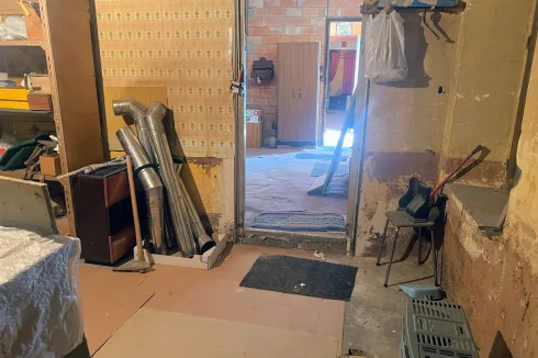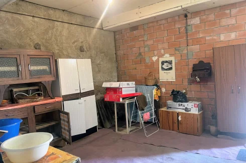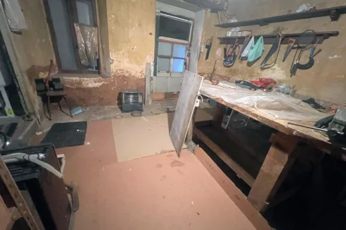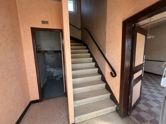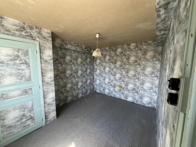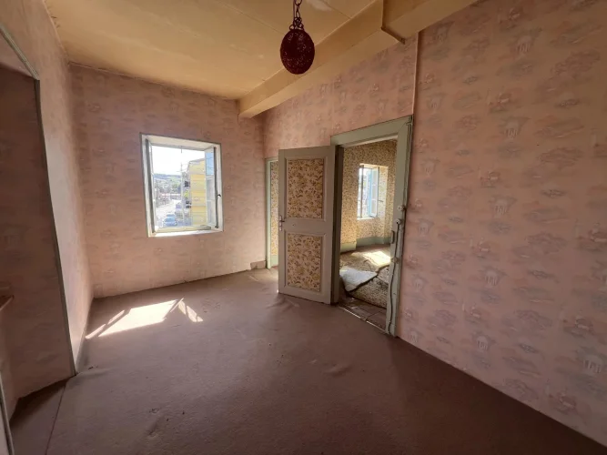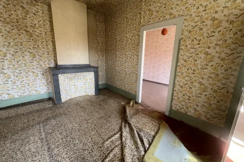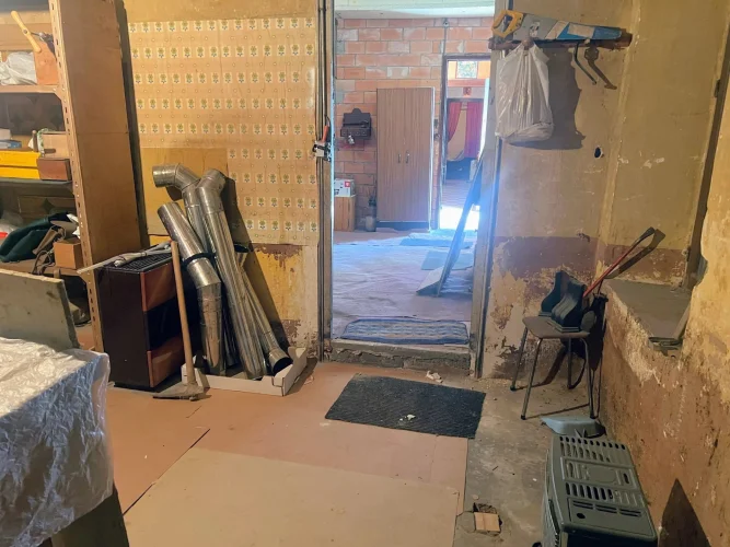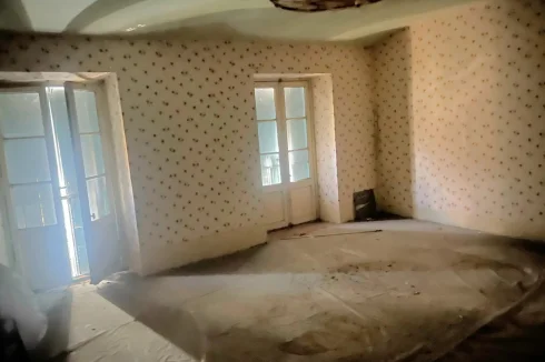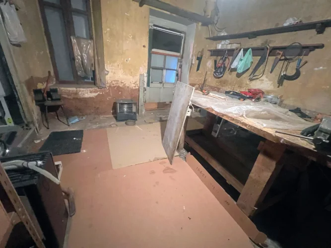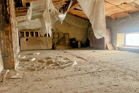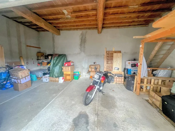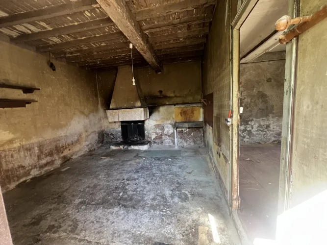 The farmhouse presents an exciting opportunity for complete interior renovation, allowing you to create your dream home while preserving its historic charm. The ground floor features an entrance hall, two spacious rooms and a garage to the left, with a kitchen and dining area to the right.