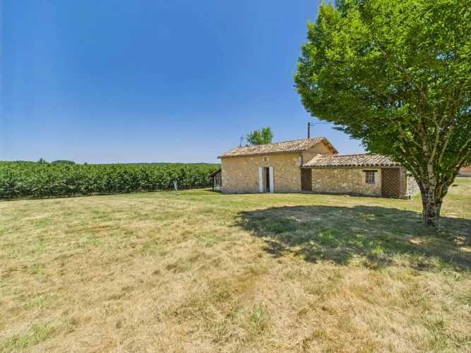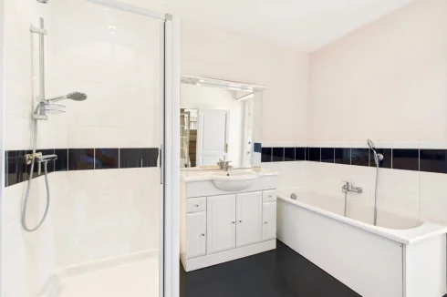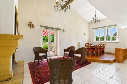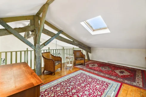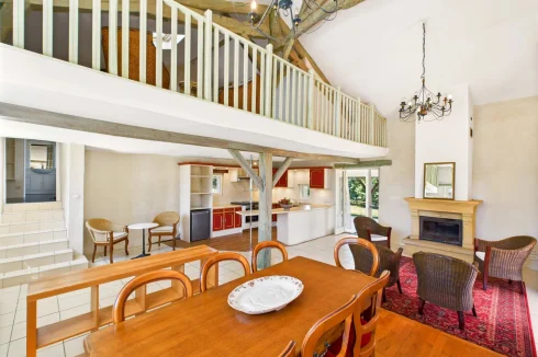 In its current configuration, it comprises two bright bedrooms, one with en suite shower room. The entrance hall also leads to another bathroom and WC. Upstairs, there is a mezzanine which could be used as a third bedroom with a dressing room. The living room of over 50m², with its open-plan kitchen and wood-burning stove, is ideal for entertaining.
