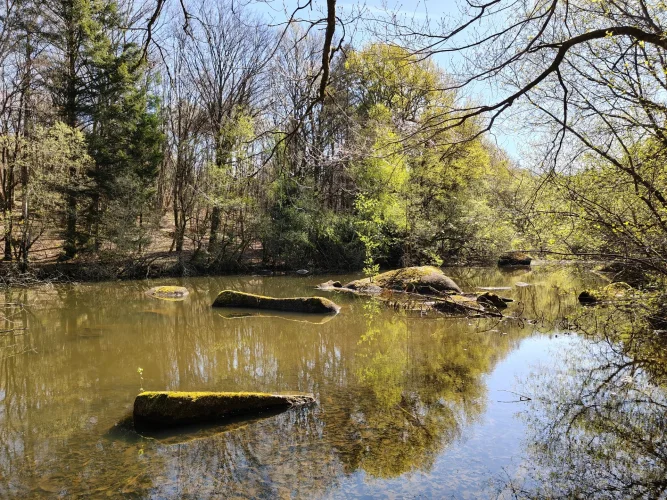 This stone building comes with adjoining outbuildings in need of restoration. It overlooks nearly 5 hectares of wooded land, in the heart of which lies an old 2,500 m² pond.