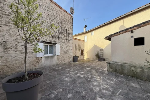 The property is set on a fenced parcel of land featuring a front courtyard and a private courtyard at the back, which includes storage space and a shed.