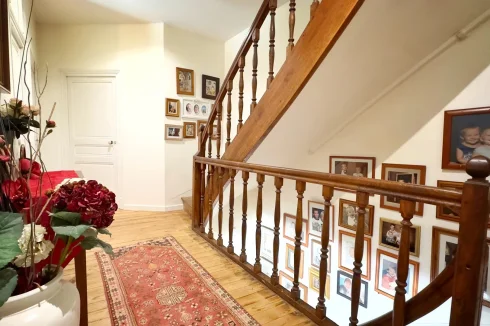 Enter into a large open-plan living area featuring a cosy wood burner and an elegant original staircase.