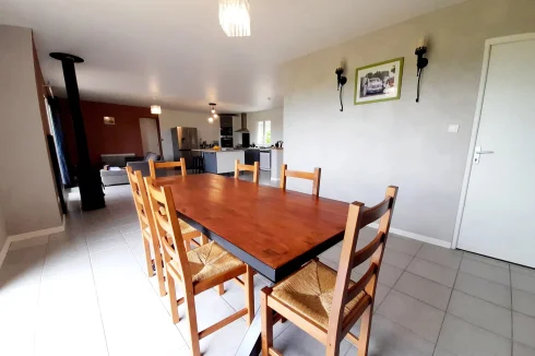 Outside, a covered terrace offers a pleasant space, while the fully fenced grounds of 1.3 hectares provide privacy, greenery, and endless possibilities for enjoying the natural surroundings. Completing the ensemble is a versatile 80 m² hangar, ideal for storage or a variety of uses.