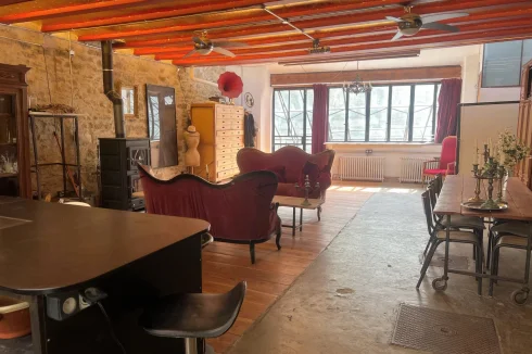 The main level features a spacious open-plan kitchen, dining and living area with bespoke industrial-style glazing, exposed stonework, high ceilings and a cleverly integrated Murphy bed to maximize flexibility. Heating is provided by a wood-fired stove that powers eight radiators, combining comfort with sustainability.