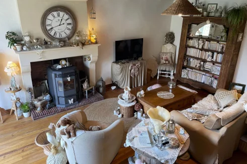 The spacious living room is a standout feature, with French doors opening onto a cosy outdoor seating area for summer dining and a quality wood-burning stove for chilly winter evenings.