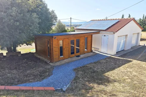 Outside there is a wrap-around decked balcony/ terrace with steps down to a 102m² tiled terrace and 8x4 infinity style swimming pool. There is also a separate purpose built air conditioned office and a large double garage that could be converted into separate accommodation if required. The gardens are planted with a variety of trees and shrubs, fully-fenced and protected by remote-controlled electric gates.