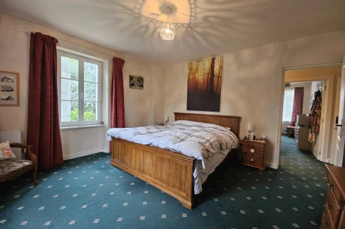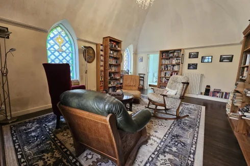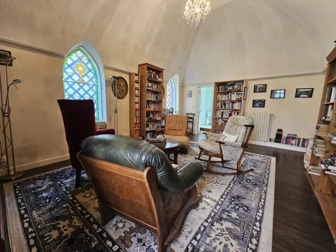 Inside, you’ll find four generous bedrooms, including a master suite with walk-in wardrobe and en suite, a stylish guest en suite, and two further large doubles. The original chapel, with its stunning stained glass windows, now serves as a unique library/reading room complete with its own shower room and WC.