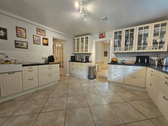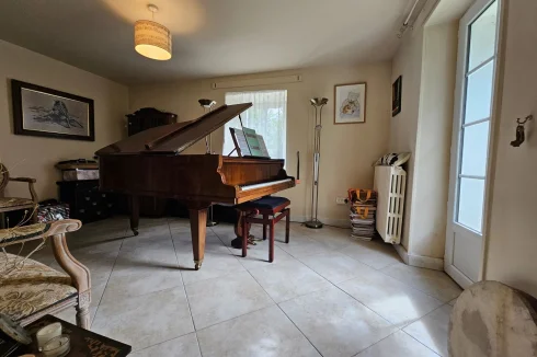 The expansive living space offers everything for family life and entertaining – a bright kitchen, welcoming dining area, cosy living room with wood burner, charming piano room, dedicated office, two utility rooms, and a convenient ground-floor WC.