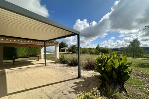 Spacious and full of character, the main house features an inviting entrance hall leading to a fully equipped kitchen and dining area with a pellet stove. French doors open onto a large covered terrace with breathtaking panoramic views over the vineyards and surrounding countryside—perfect for al fresco dining and entertaining. The property also boasts two generous living rooms, both with direct outdoor access, providing excellent flexibility for additional seating areas, a study, or even a studio.
