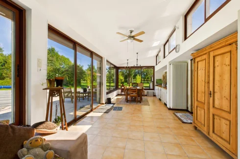 The ground floor of the house has a large lounge/dining area that leads through to a kitchen and on to a large sunroom that overlooks the in-ground pool.