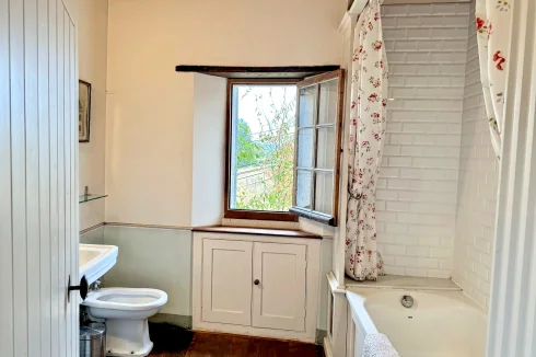 The inviting living room boasts a Dovre log-burning stove, creating a cosy atmosphere for relaxing evenings, while the ground floor also offers a stylish bathroom with a freestanding bathtub.