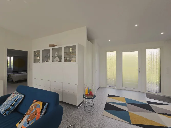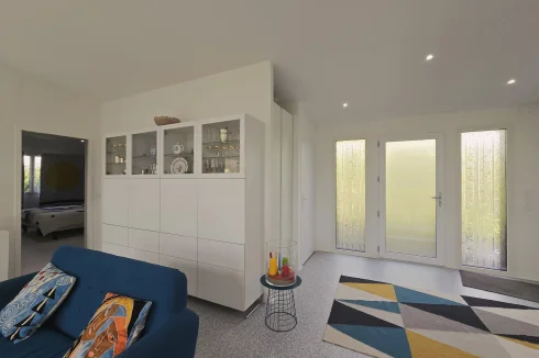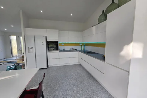 It comprises a large, bright living room with open-plan kitchen, dining room and lounge, as well as three bedrooms, each with its own en-suite shower room and WC. A separate guest WC and a pantry with storage space complete the property. Wine cellar and hobby room accessible from the outside.