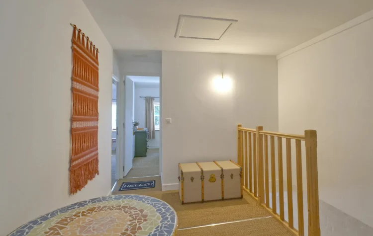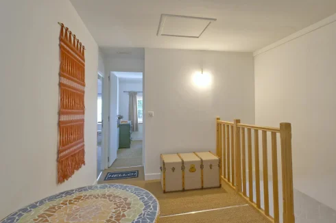 The stone staircase leads to a spacious first-floor landing, where you’ll find three generous, light-filled bedrooms, and a toilet with a sink.