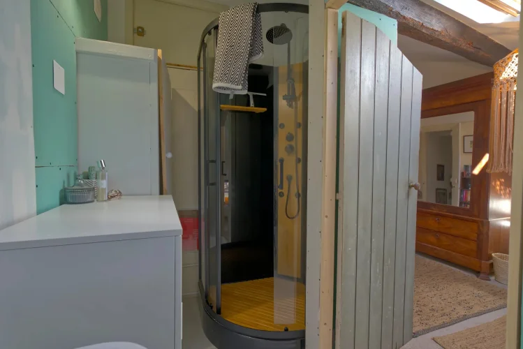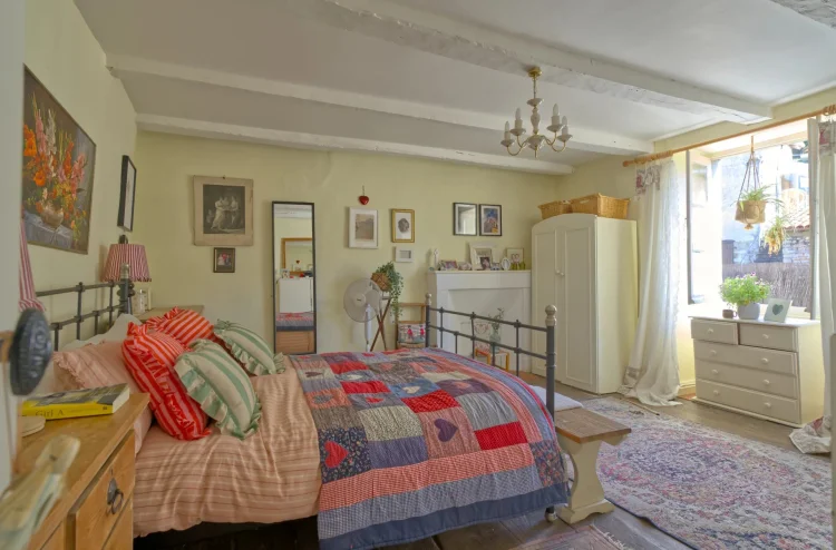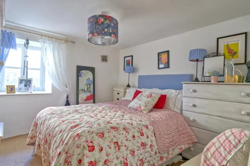 You are welcomed into a warm and inviting living / dining area / kitchen area, complete with a cosy wood-burning stove. On the first floor is a double bedroom and spacious bathroom / laundry room. A second double bedroom at the top floor, complete with en suite shower room — ideal for visitors, and a smaller 3rd bedroom or office with a dressing room.