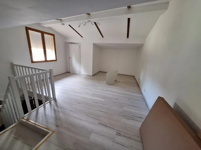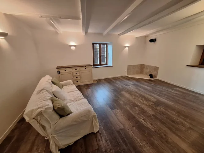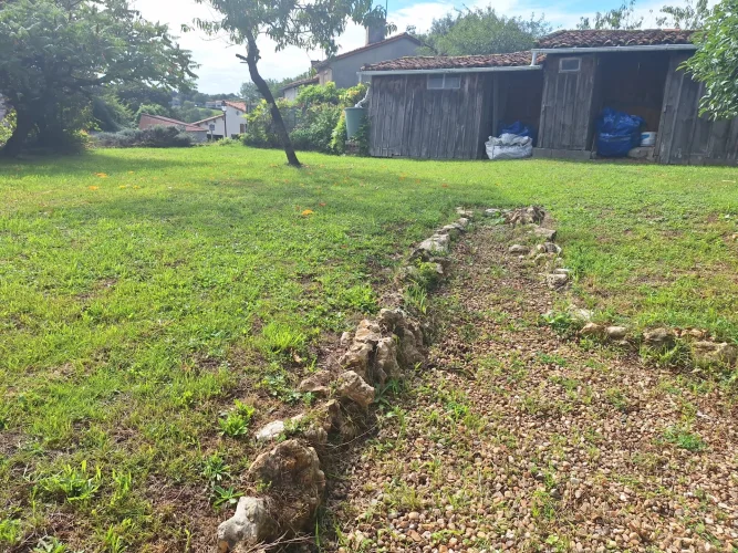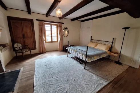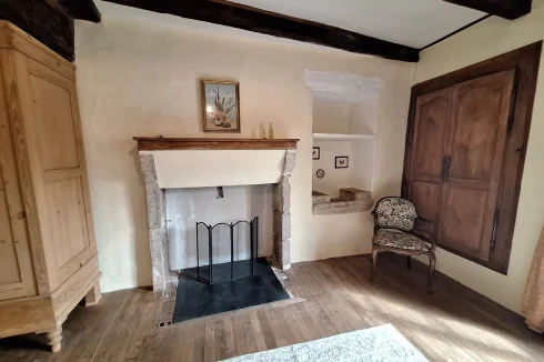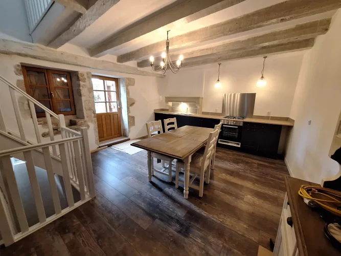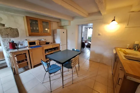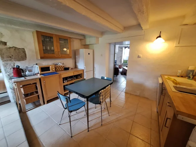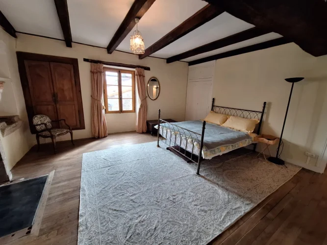 Located in a quiet part of the historic village of Charroux, this property has a pleasant attached garden and original features throughout. Previously two houses, the larger part of the property offers a spacious lounge with exposed beams and a wood burning stove. This leads to a simple kitchen-dining area and then onto a more formal dining room with access out onto the garden. There is a modern bathroom and W.C. on this floor. Upstairs are three double bedrooms one with a large en suite bathroom.