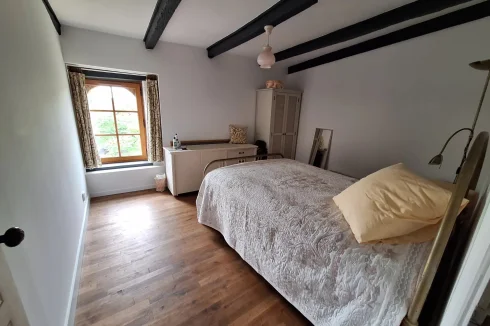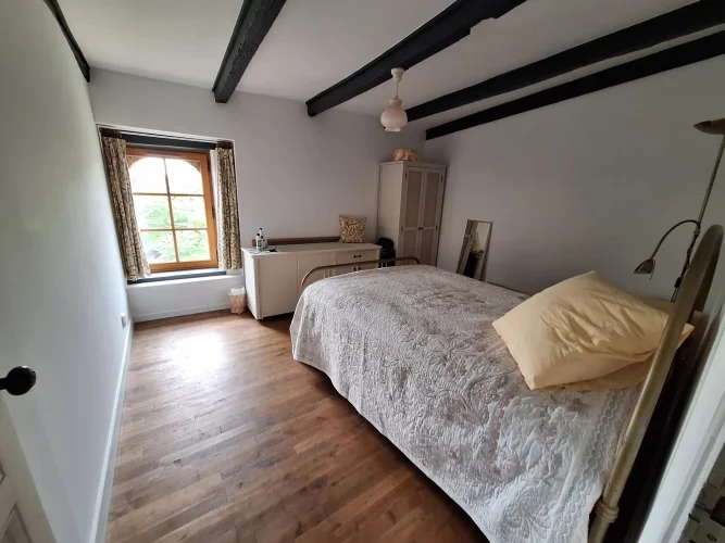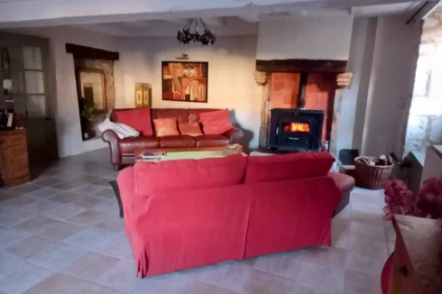 The house is mainly double-glazed, has some electric underfloor heating in the kitchen and bathroom to supplement the wood burning stoves. It is connected to mains drainage and there is also town gas available if you wanted to consider installing central heating.