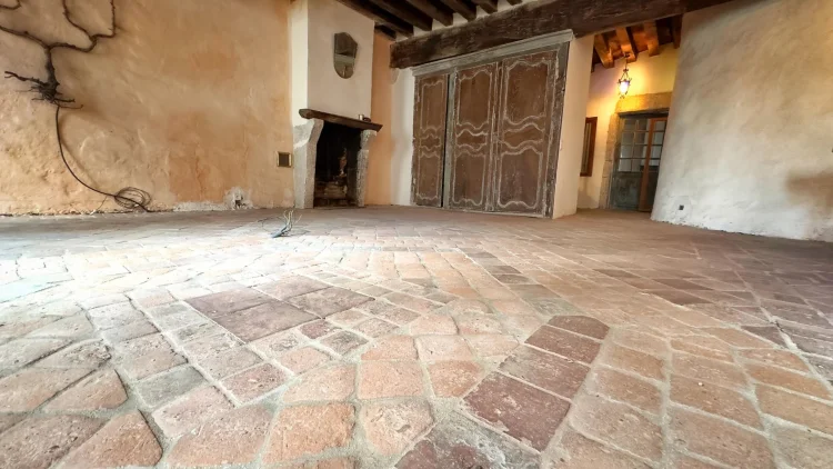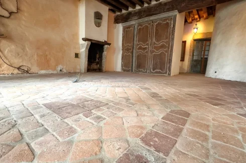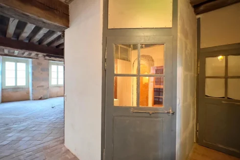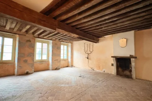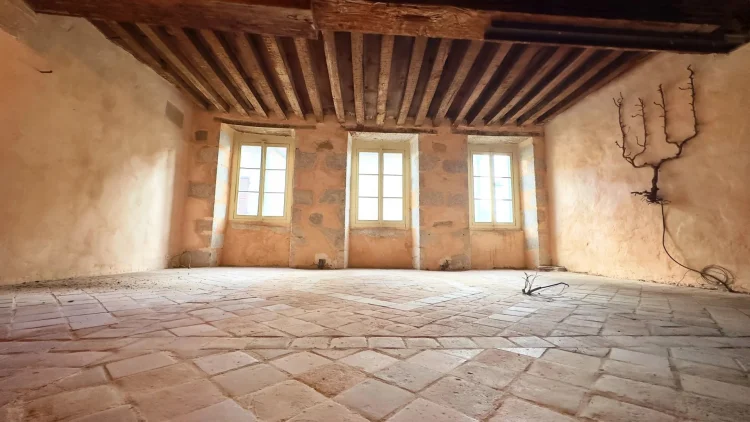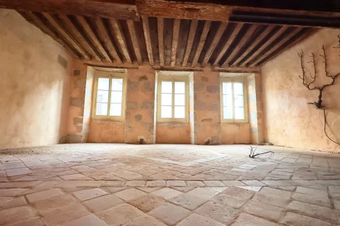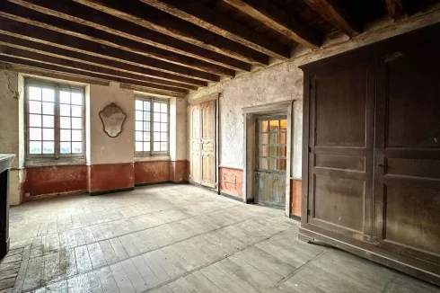 The characterful living spaces feature exposed beams, original doors and cupboards, and vintage tommette flooring, adding to the historical ambiance. Large windows allow natural light to flood the interior, highlighting the rustic details and creating a warm, inviting atmosphere throughout.