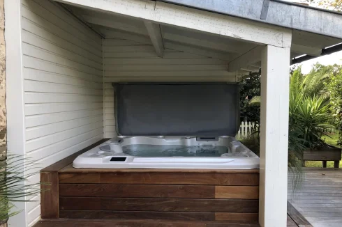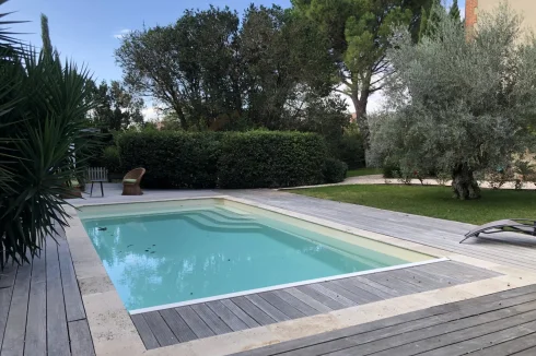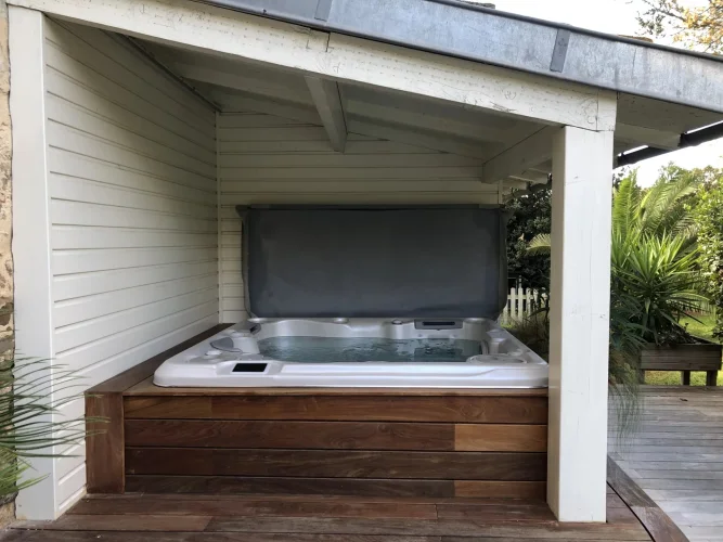 From the kitchen you can go out to the side terrace which is decked in Ipe wood where you will also find the outside kitchen / bar area. The beautifully kept gardens and pathway wends its way towards another covered seating area under the trees, to the pool, Jacuzzi and additional covered seating area. An oasis.