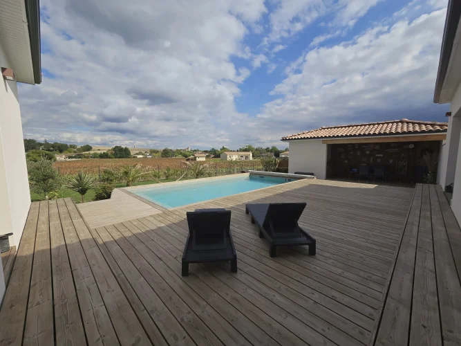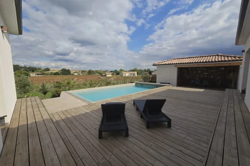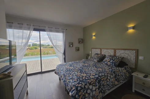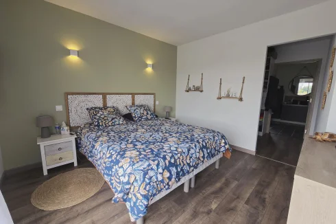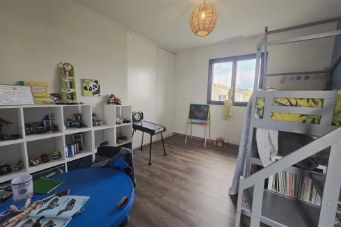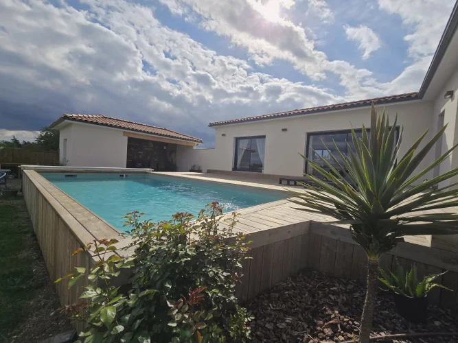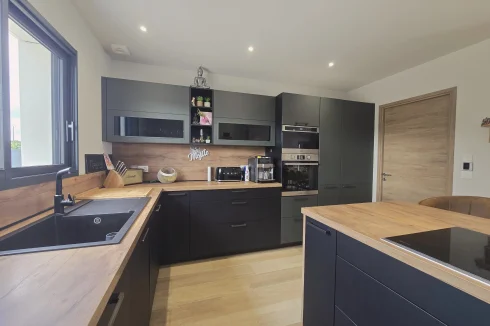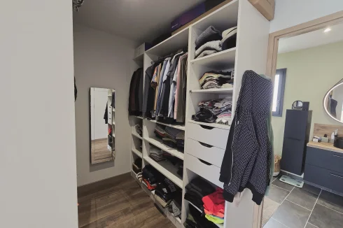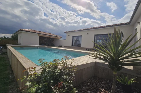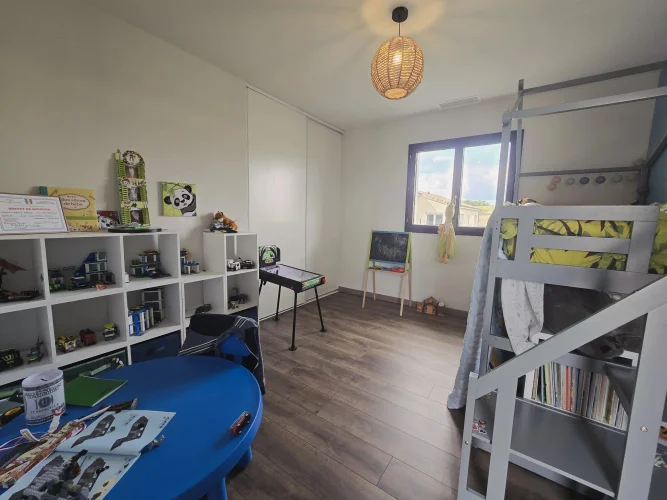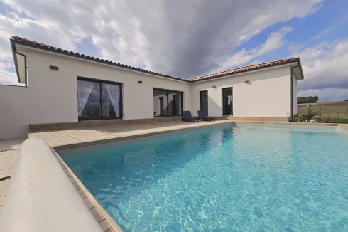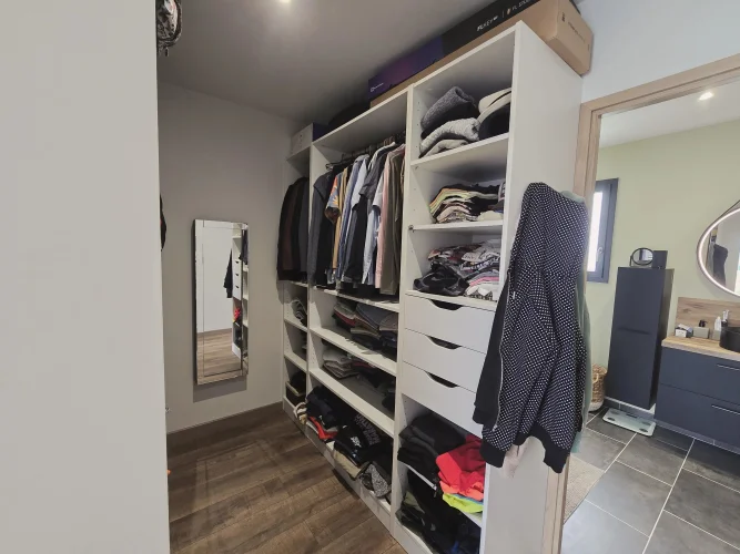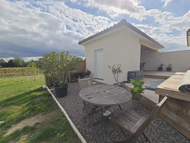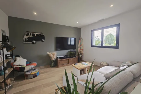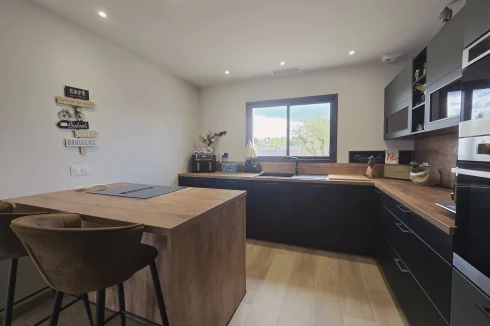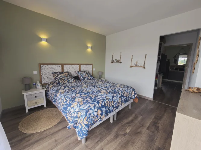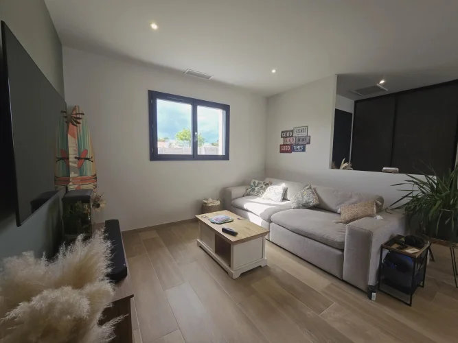 This charming and modern single-story house offers comfort and conviviality. It features a bright living room with adjoining kitchen, three bedrooms, a dressing room, and two shower rooms.