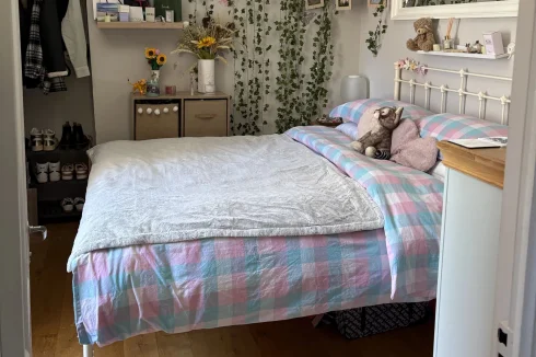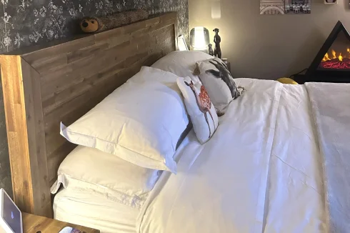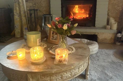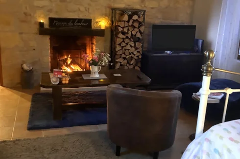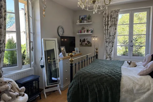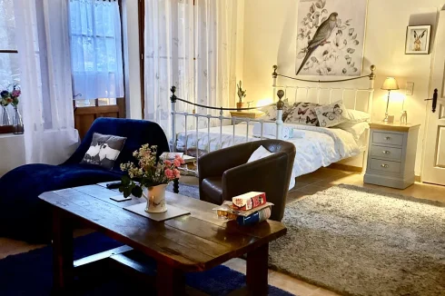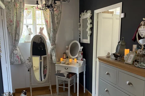The property spans two levels. The ground floor features a welcoming living area with fireplace and underfloor heating, creating a warm atmosphere throughout the year. The fully fitted kitchen is designed for everyday use as well as entertaining. Across the entrance is a large, light-filled bedroom, with its own fireplace and en suite shower room. This part of the cottage could be separated off for guests.