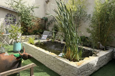 Outdoor space is another highlight. A private courtyard with garden, shaded terrace, and a tranquil pond with fountain make it ideal for both relaxation and summer meals outdoors.