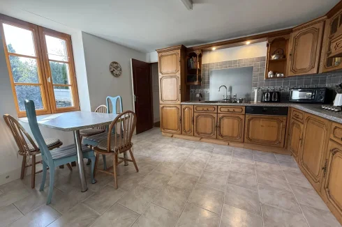 The light-filled kitchen is a lovely space for cooking and entertaining, with plenty of room to prepare meals while chatting with friends. Sunshine streams through the windows on bright days, while a wood stove keeps the space inviting during cooler months. The fitted wooden units are of good quality and could be easily refreshed with a little paint and new handles.
