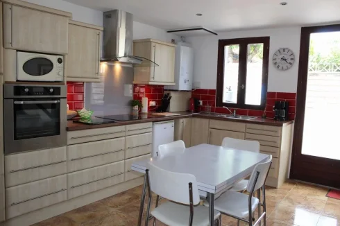 EXCLUSIVE TO BEAUX VILLAGES! Discover this renovated village house, where authentic character meets modern comfort. The living room boasts a welcoming corner fireplace with a wood-burning stove and traditional terracotta floor tiles, creating a warm and inviting atmosphere.