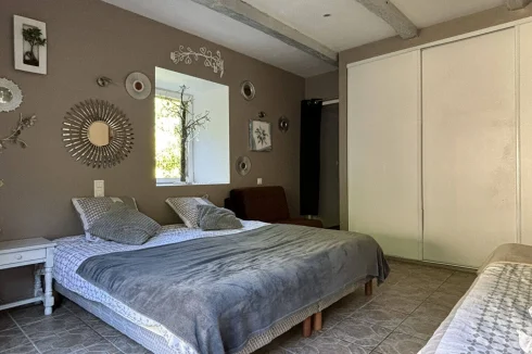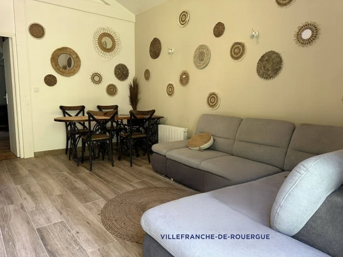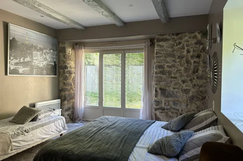 In a beautiful natural setting, this charming and characterful property is bordered by a stream and comprises two houses with a swimming pool on 5,003 m2 of grounds. The main house, measuring 86 m2, features a spacious fitted kitchen with a contemporary suspended wood-burning stove, a cozy living room with a mezzanine bedroom, a large bedroom on the garden level with a closet, a dressing room, and a bathroom with double sinks and a walk-in shower. The second house has of 45m2 living space, including a living room/kitchen, a bedroom with two beds on a mezzanine, a separate toilet with washbasin, and a bathroom with walk-in shower. A tiled terrace at the rear overlooks a beautiful green setting. The property is sold furnished and equipped (except for some wooden furniture in the living room), ready for rental or habitation. Beautiful amenities throughout, recent renovations, this main residence, currently operated as a furnished tourist cottage, generates substantial income. Discover this peaceful, unobstructed property in a natural and relaxing setting, just 10 minutes from VILLEFRANCHE and a few minutes from a village with a school, bakery, and cafe-restaurant.