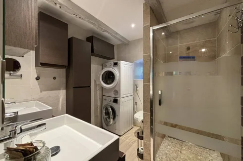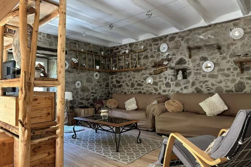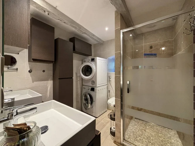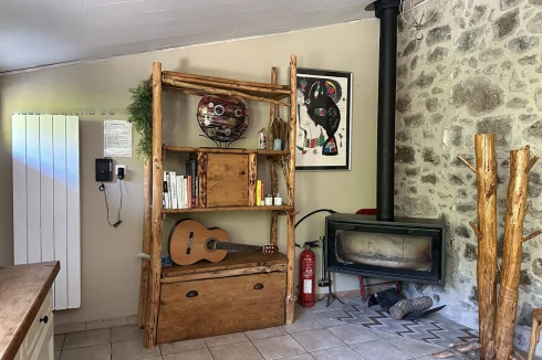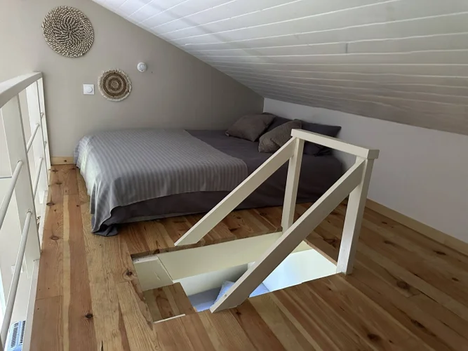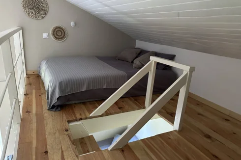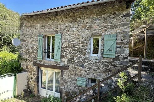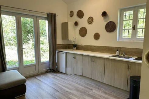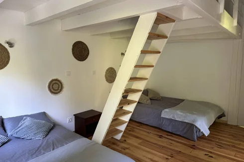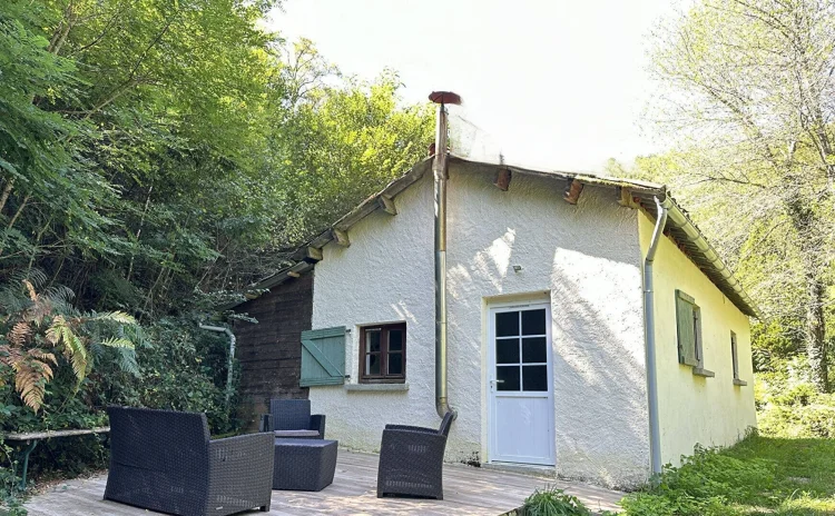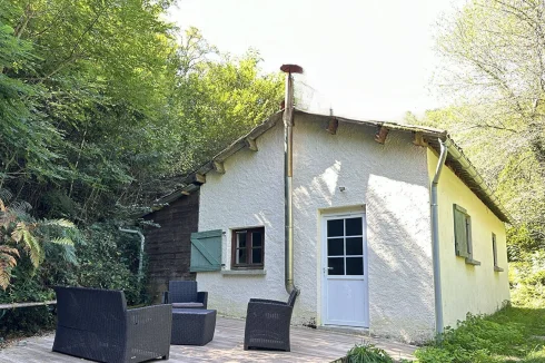 The second house has 45 m2 of living space, including a 19 m2 living room/kitchen, a 20 m2 bedroom with two beds on a mezzanine, a separate toilet with washbasin, and a bathroom with walk-in shower. A tiled terrace at the rear overlooks a beautiful green setting. The property is sold furnished and equipped (except for some wooden furniture in the living room), ready for rental or habitation.