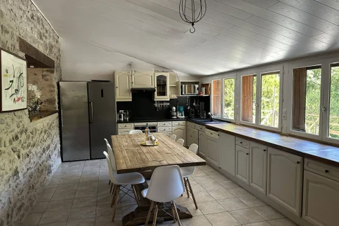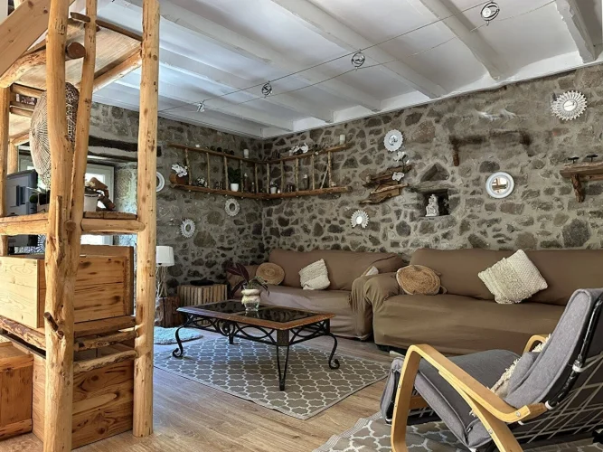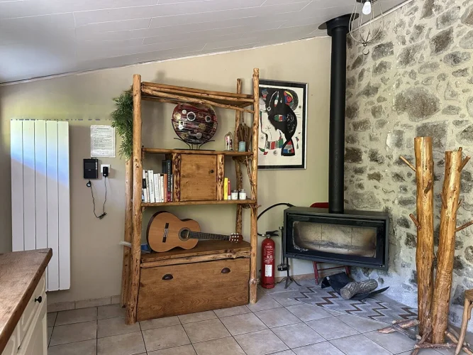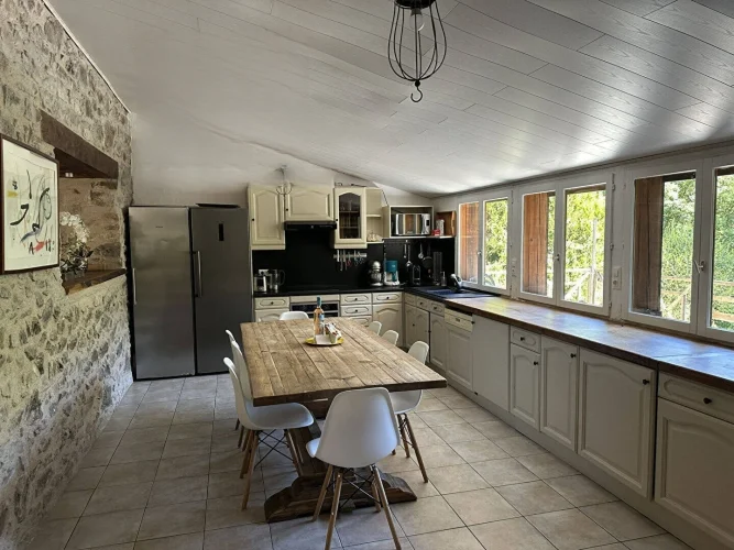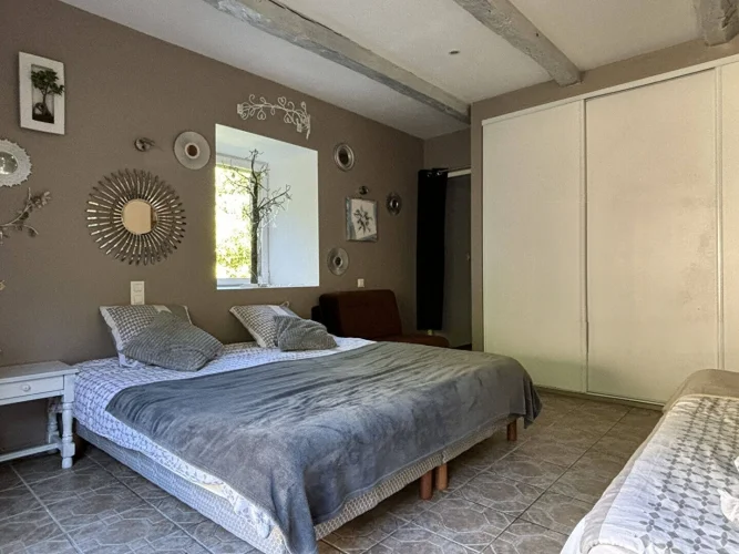 In a beautiful natural setting, this charming and characterful property is bordered by a stream and comprises two houses with a swimming pool on 5,003 m2 of grounds. The main house, measuring 86 m2, features a spacious 27 m2 fitted kitchen with a contemporary suspended wood-burning stove, a cozy 30 m2 living room with a mezzanine bedroom, a large 16 m2 bedroom on the garden level with a closet, a 6 m2 dressing room, and a bathroom with double sinks and a walk-in shower.