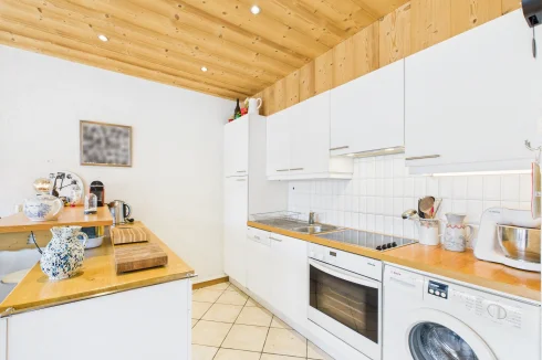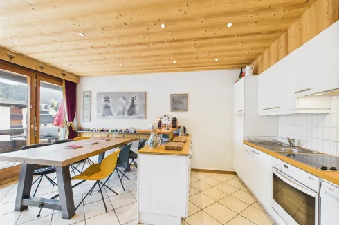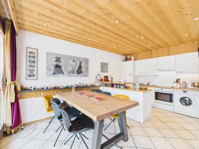 The apartment has been nicely renovated throughout and is as spacious as it is stylish. A large entrance hall with storage space leads to the three bedrooms (one of which is en suite), a second bathroom. The light and airy living room includes a sitting area, a fully equipped kitchen, and a dining area, with access to a southeast-facing balcony offering excellent sunlight and a pleasant view of the village and surrounding mountains. A private garage and a cellar are included in the sale.