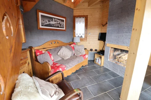 Compact and bijoux, this is a rare opportunity to purchase a chalet at the price of an apartment. It has a delightful and charming layout, with lots of interesting angles and shapes, all accented with nice woodwork and stone features. The living room has a central fireplace, a kitchen to one side and patio doors leading to the large terrace. There are two bathrooms and two bedrooms and the property is sold with a lock up garage.