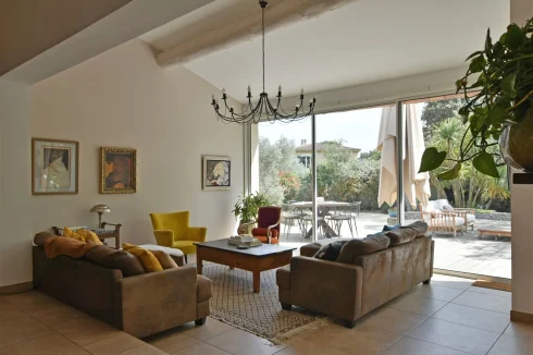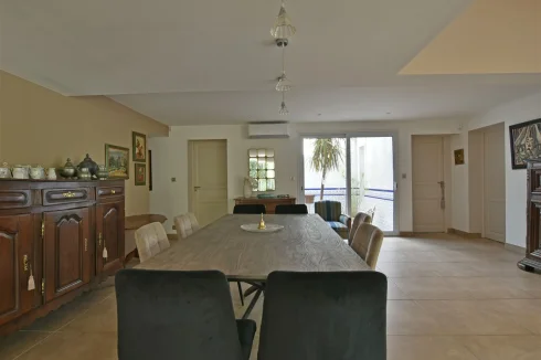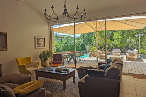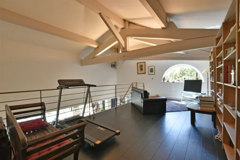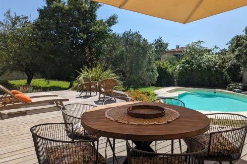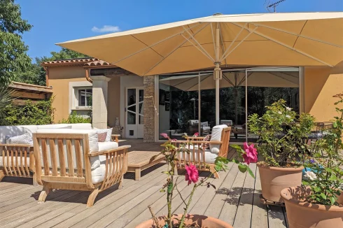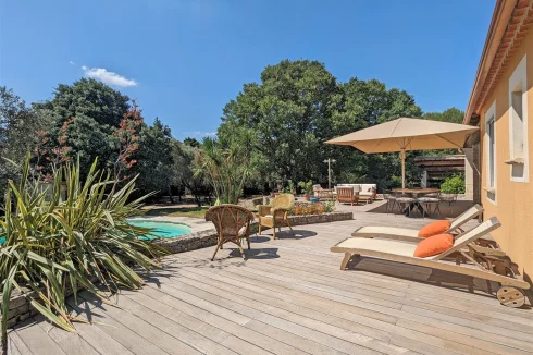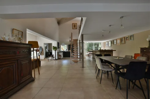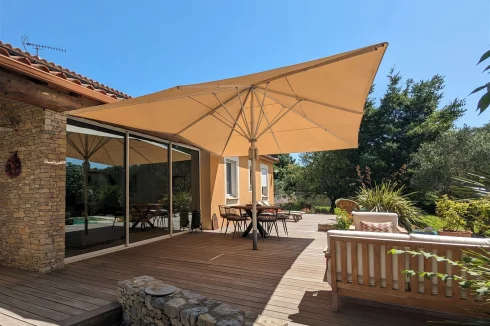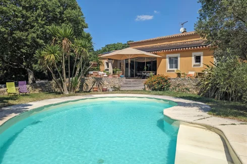 This wonderful villa is situated in the hills just outside Nimes, on a beautiful wooded plot of land with a swimming pool. The house is very spacious and well laid out with a large living room with a mezzanine gallery, a lounge opening onto the terrace and garden, and a semi-open fitted kitchen. In addition there are three bedrooms on the ground floor, each with a shower room, and one bedroom upstairs. There is a large wood terrace off the living room and a terrace off the kitchen. The swimming pool is delightfully sunny and has a paved sunbathing area. The property also has a very useful carport and separate 16m2 outbuilding with shower room and toilet.