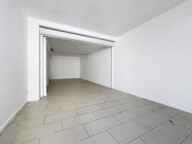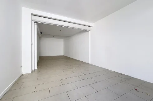 Ground floor: You enter the house via a spacious garage. The hallway leads to a bathroom (shower, washbasin, WC), a storage room, and a bedroom with access to a small patio.
