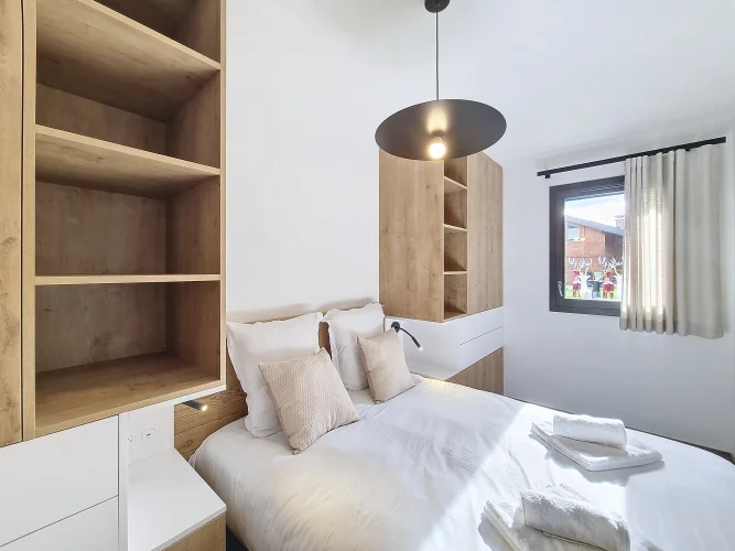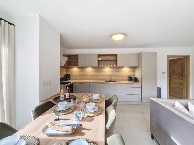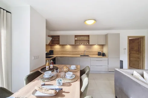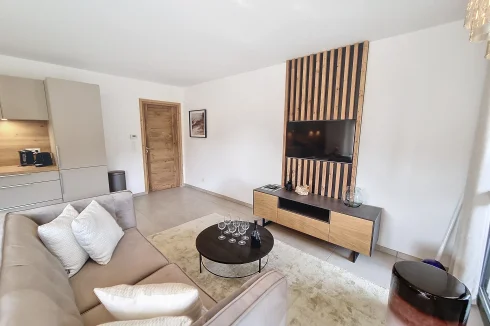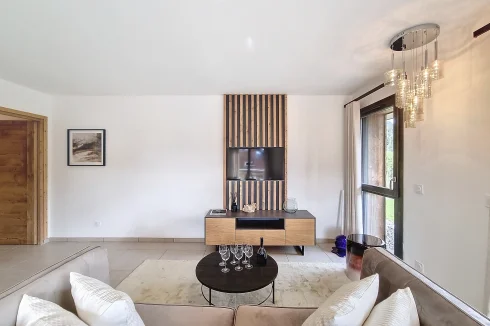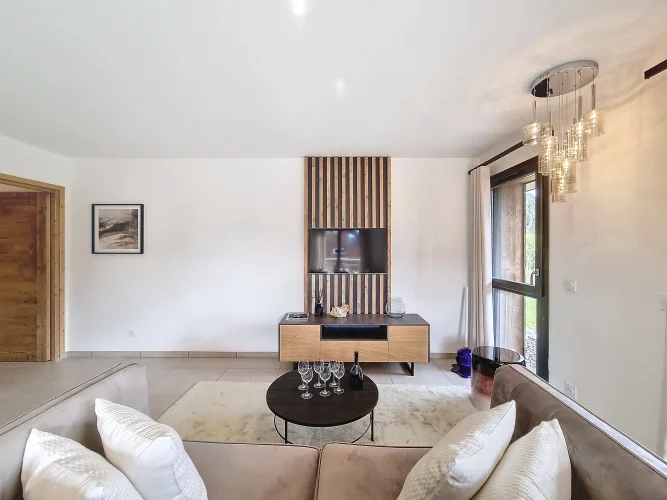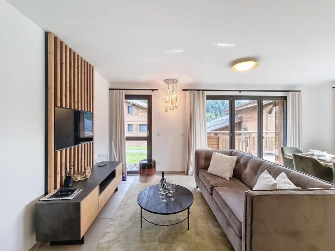This superb apartment is in a recently built development on the road leading up to Mont Chery from Les Gets. It is therefore in a peaceful setting, facing the south and has excellent views and sunshine in its private garden. The apartment has two bedrooms, each with private bathroom> There is also a lovely sunny living room which opens onto a terrace. The private garden of 288 m2 has a hot tub to relax in after a hard day on the slopes.The property is sold with two parking spaces, a cellar and a ski locker.