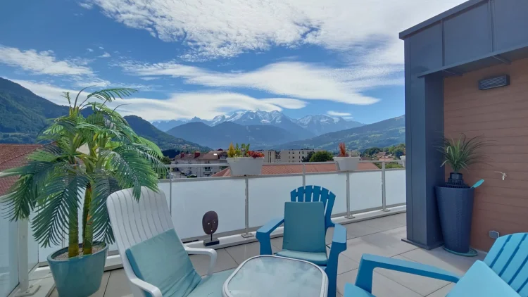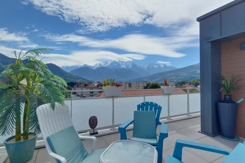 This stunning penthouse apartment, with its roof terrace looking towards Mont Blanc, is perfectly located, between Megeve, Chamonix and Saint Gervais and handy for the autoroute to Geneva or Italy. The views of the Mt Blanc massif are exquisite in this modern well appointed apartment.