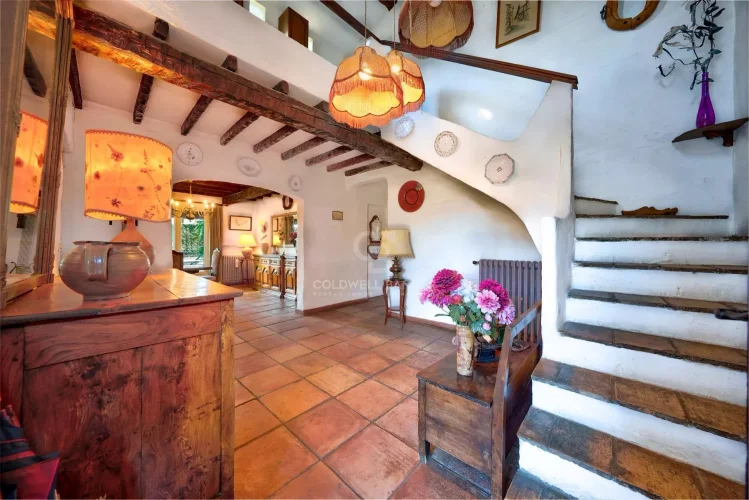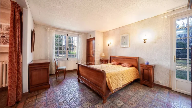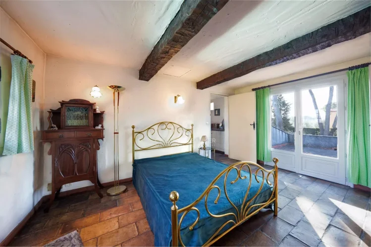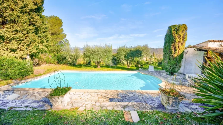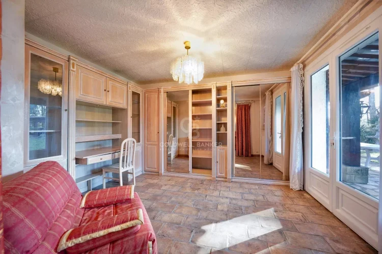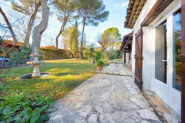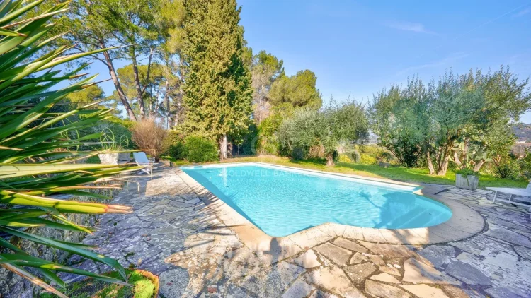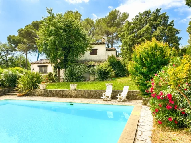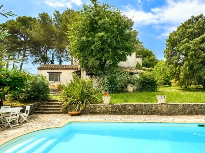 Pretty and provençal villa of around 150 sqm consisting of an entrance, a living room with fireplace and dining room, a kitchen with independent access, two large bedrooms, two bathrooms and guest toilets. On the first floor, the house includes a third bedroom with bathroom and a terrace. It is set on a flat land of 2456 sqm with a large swimming pool and Summer kitchen, carport for two cars. The villa needs to be renovated. Easy access to schools, motorway, airport or Cannes and few minutes to the shops. It has hill views.