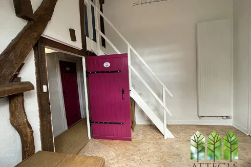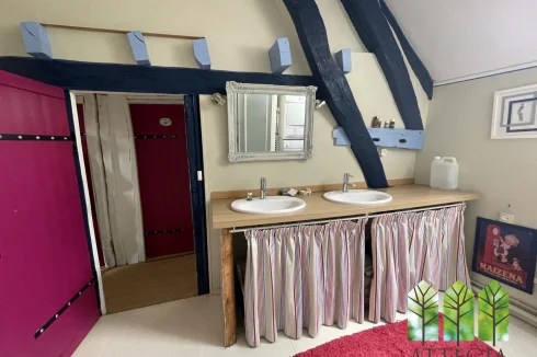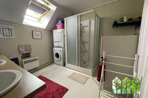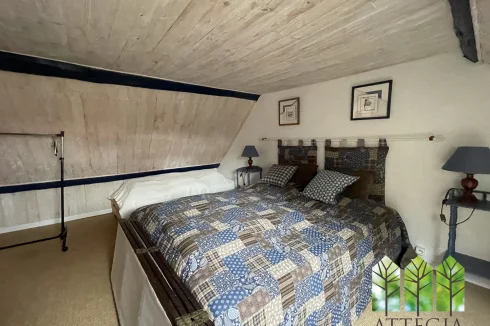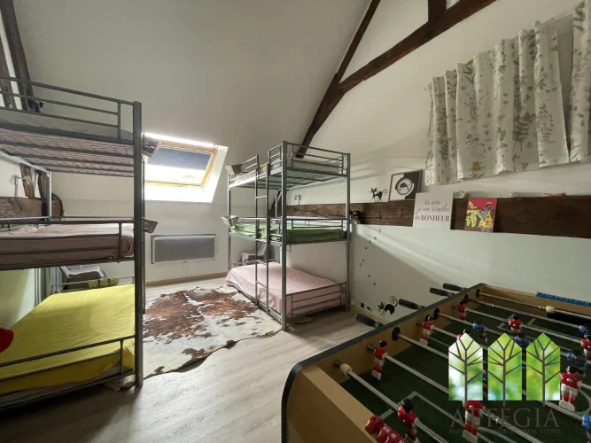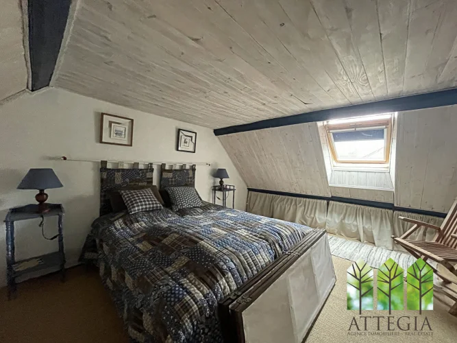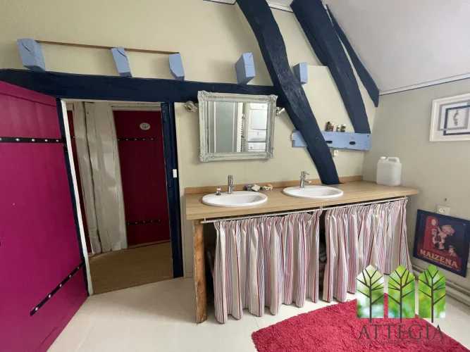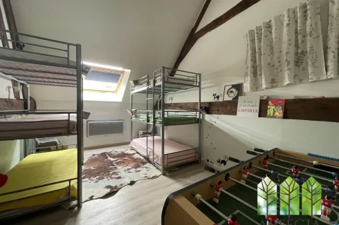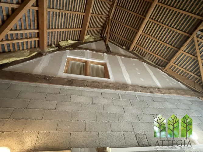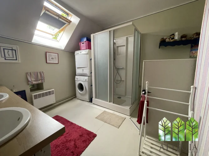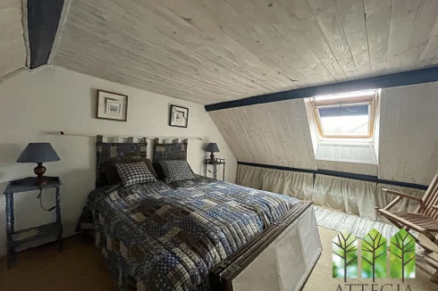 Upstairs, a hallway leads to two bedrooms (10 m² and 9.5 m²) currently separated by a removable wooden partition, allowing the option to create one larger room. This level also includes a 10 m² shower room with WC, an 8 m² mezzanine, a spacious 21 m² bedroom, and above that, a 8.5 m² attic room suitable as a guest bedroom or office.