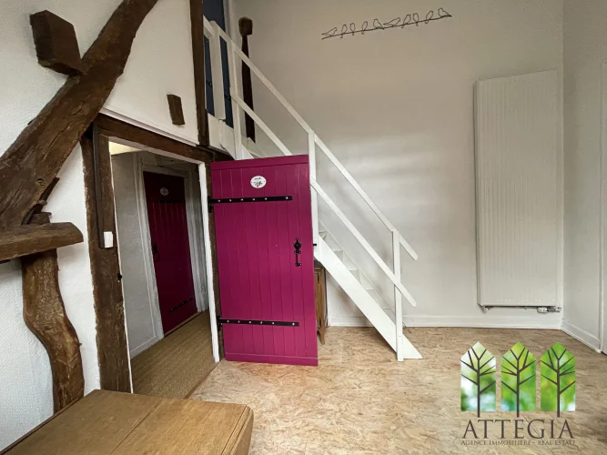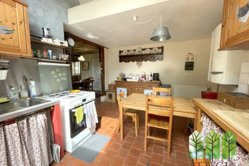 The ground floor offers single-level living, with a bedroom and a bathroom on the same level. A bright 35 m² living room with a wood-burning stove (installed 5 years ago) flows into a 16.5 m² dining area. The 16 m² kitchen (to be fitted) provides direct access to the adjoining barn.