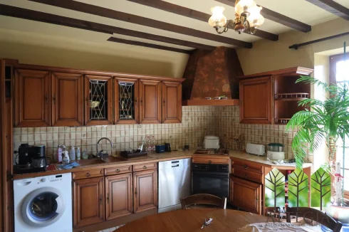 17 m² living room with fireplace (not connected to a flue) and oil-fired central heating. 17 m² fitted and equipped kitchen with bay window and direct view of the listed church.